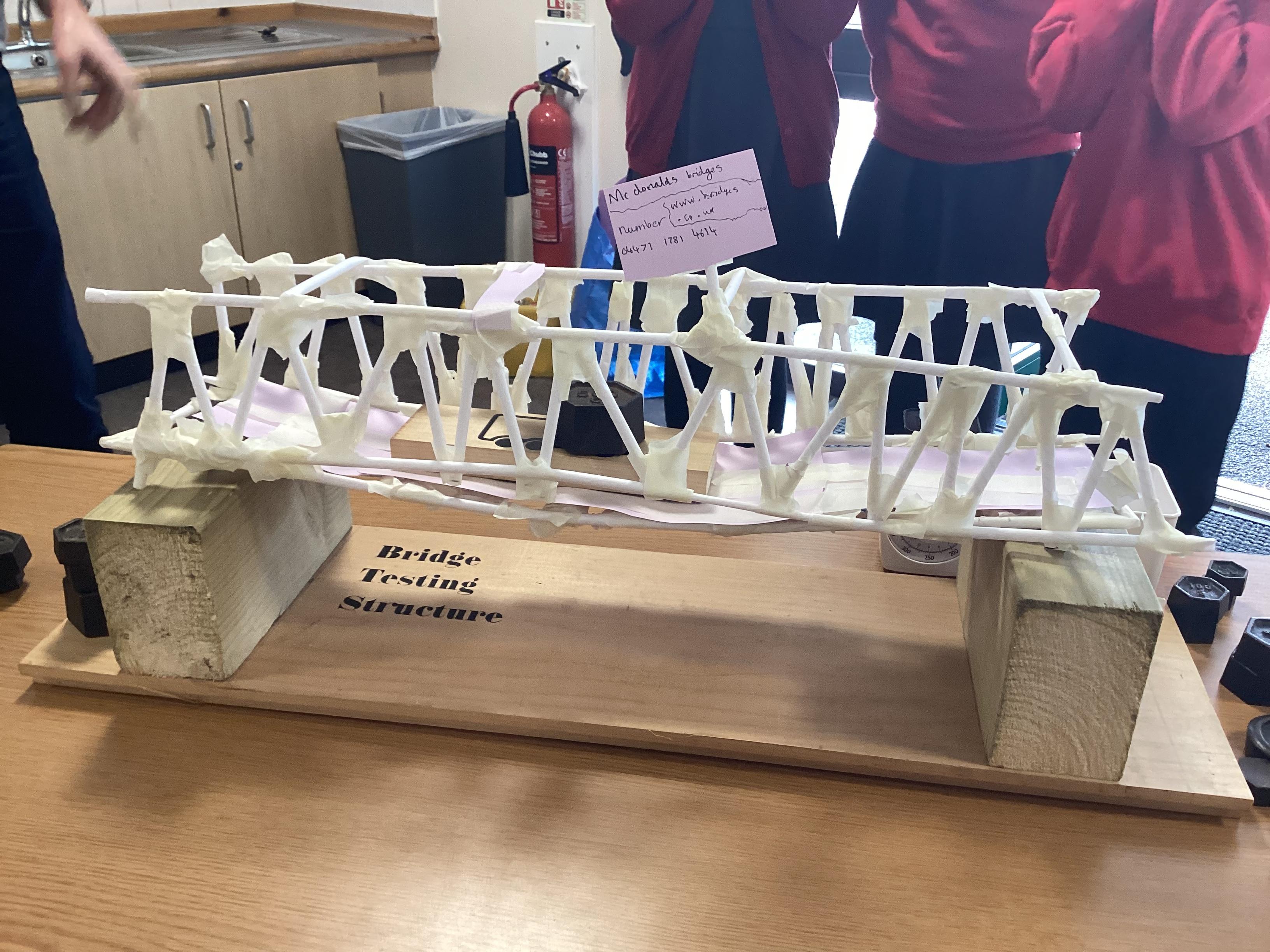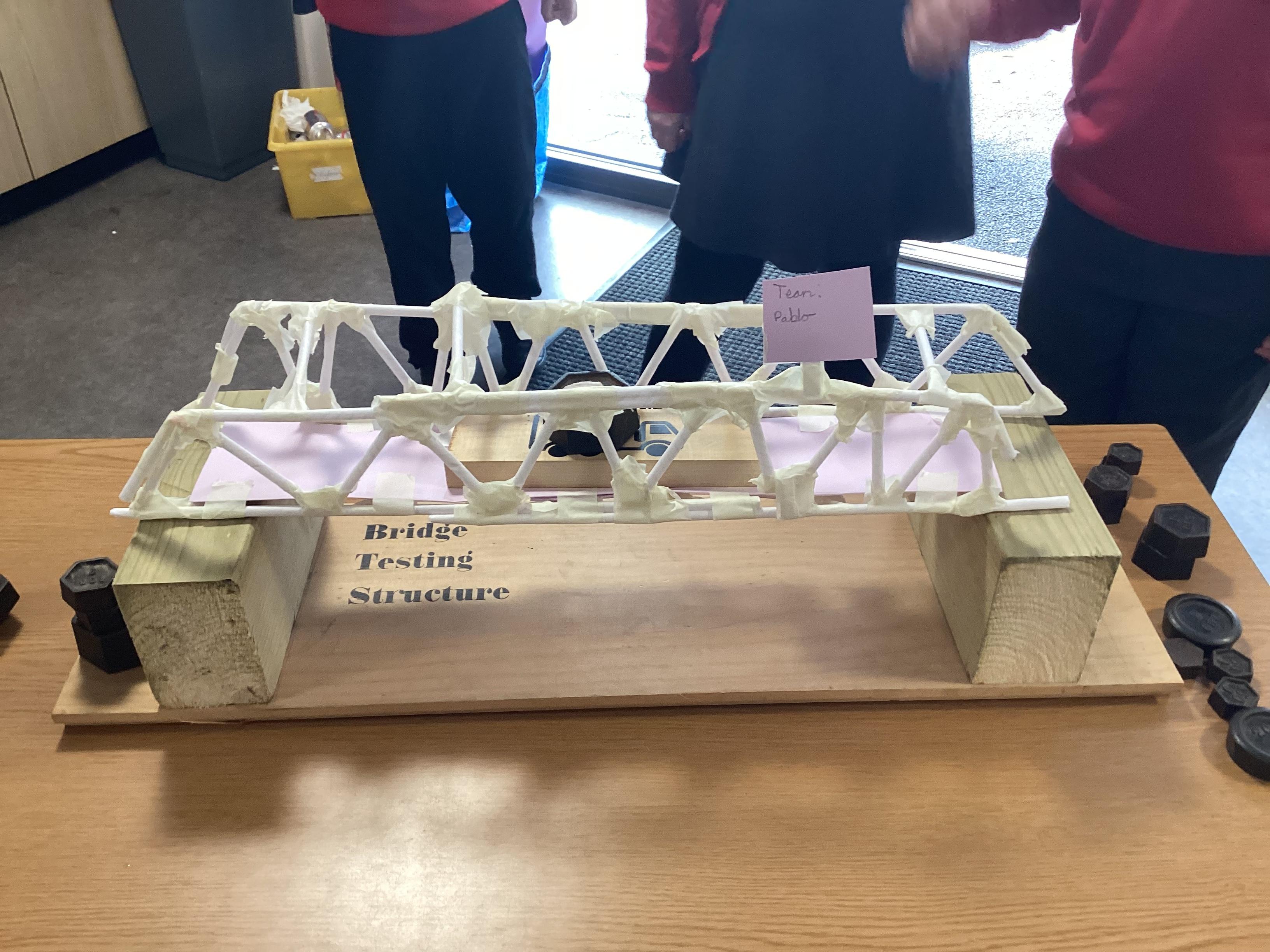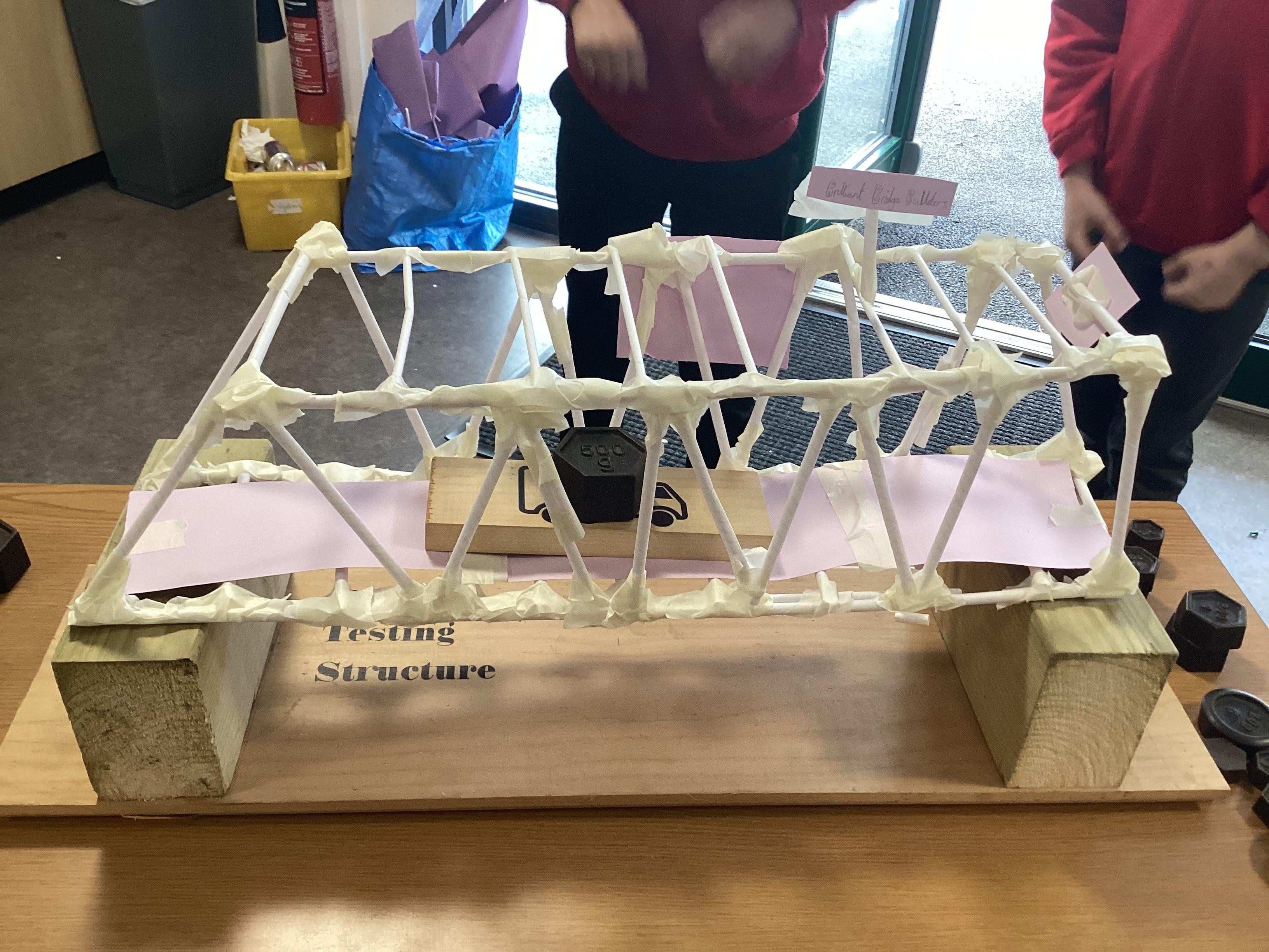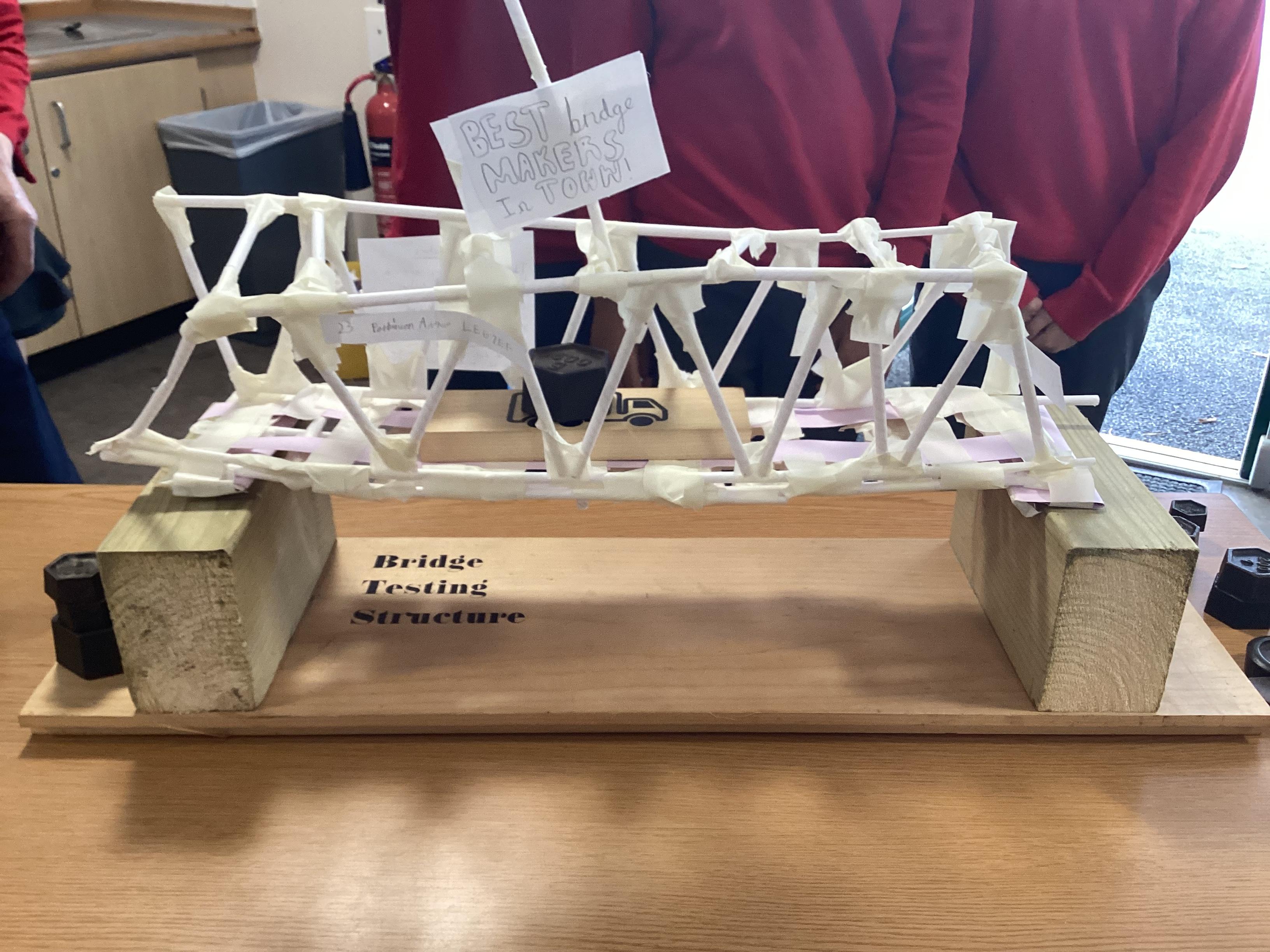 We gradually added weights to each bridge until it collapsed! All the bridges carried at least 1000g, and the winning bridge supported 1900g! It was very tense! There were prizes for the top team in each category.