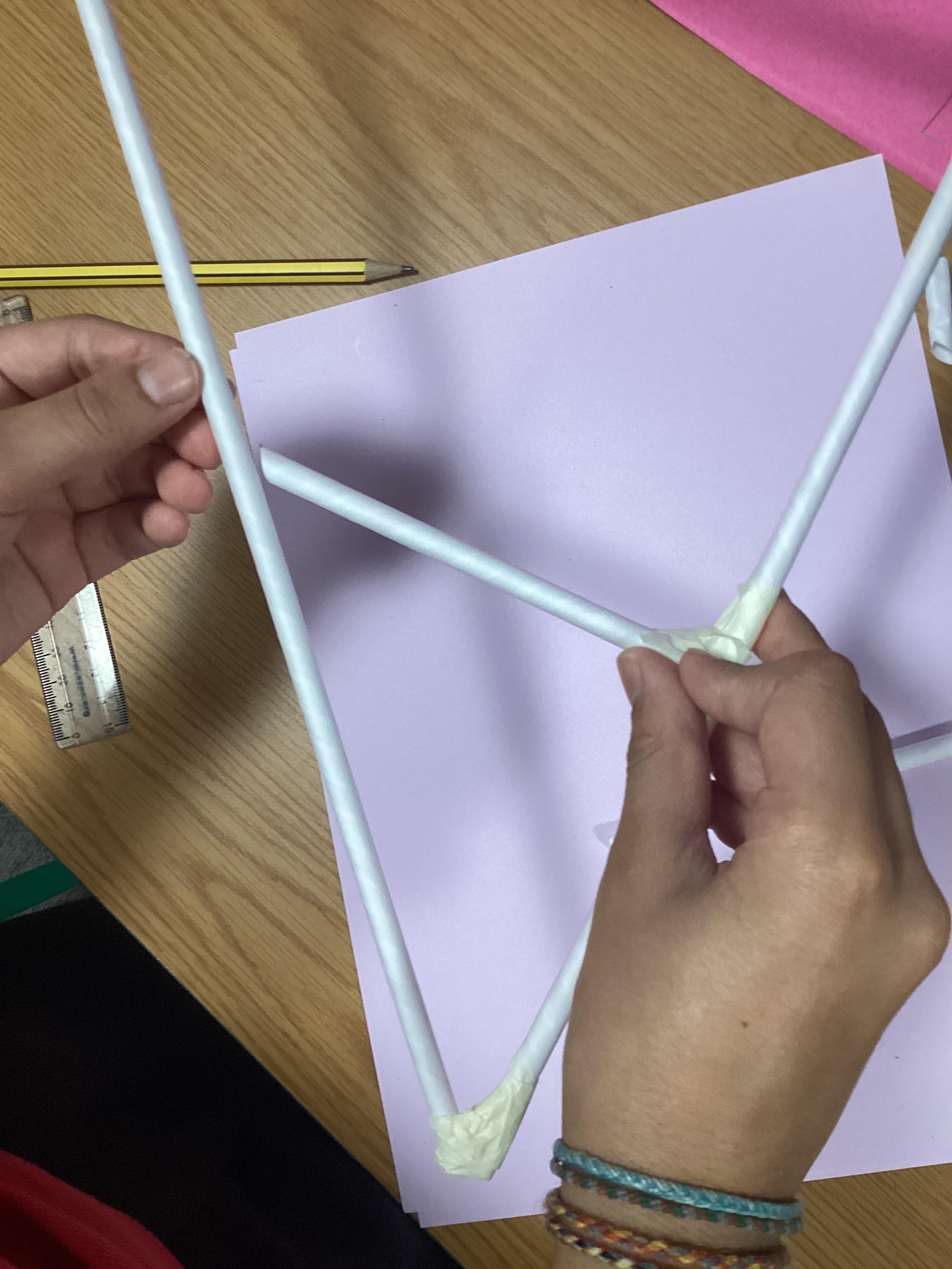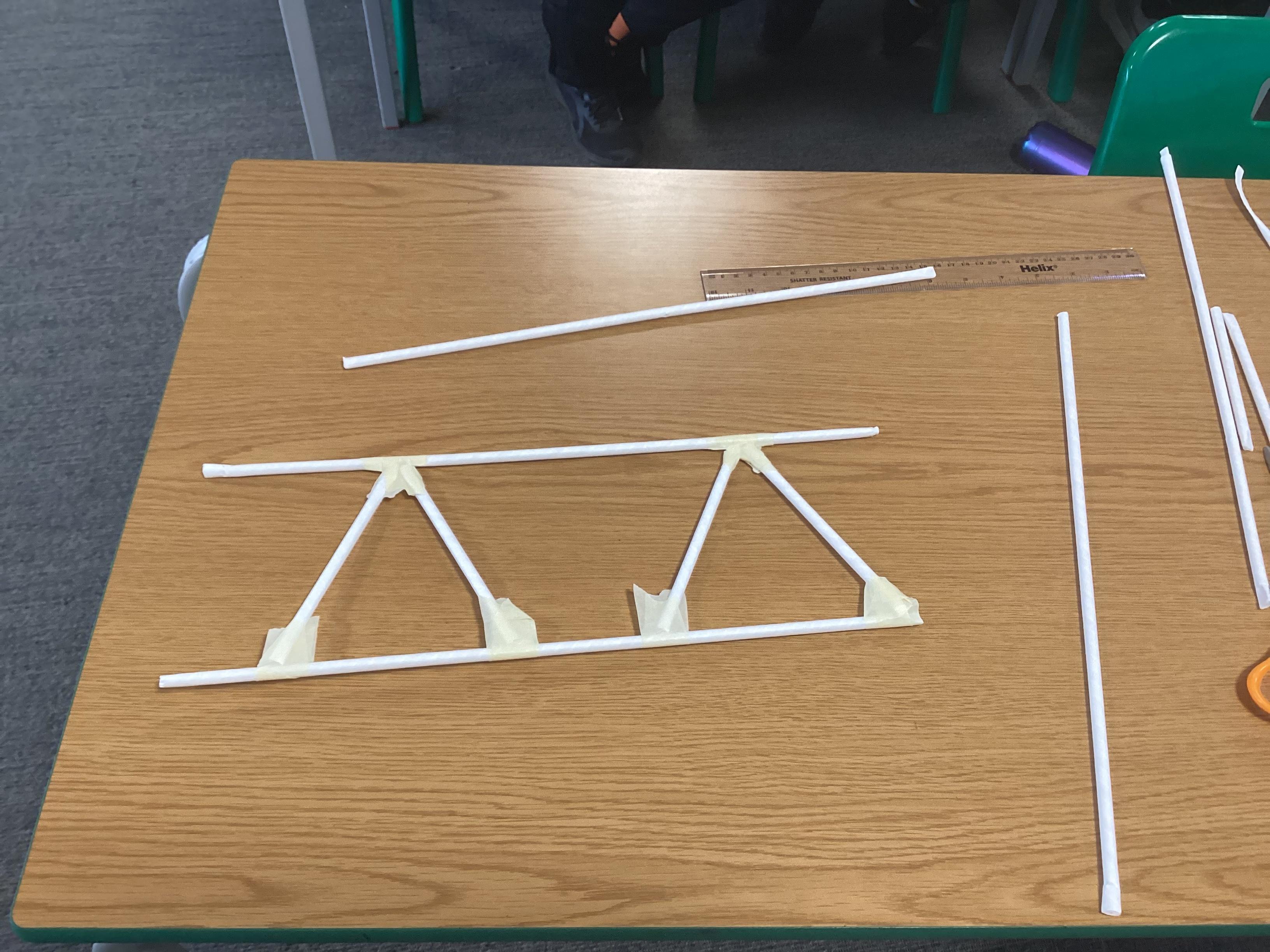 We brought our plans to life and adapted them when we needed to. We used art straws of two different sizes and masking tape. We used what we had learned about different types of trusses, including warren, Pratt and lattice.
