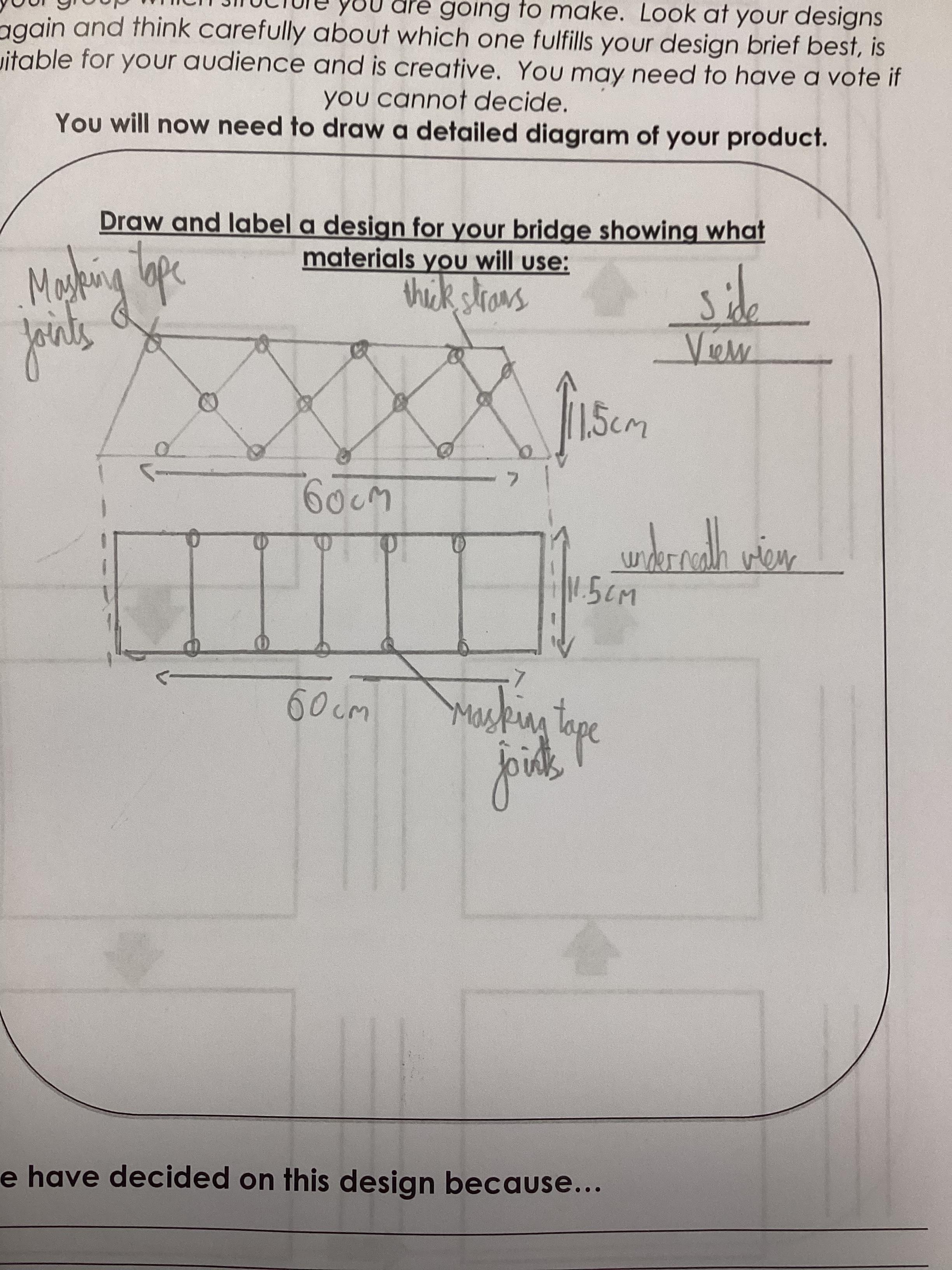 We had to design and build a bridge that could be used in an emergency, such as an earthquake to help transport people and goods where they are needed. The bridge had to support 500g, span a 45cm gap, allow the lorry to pass through and be as efficient to build as possible.