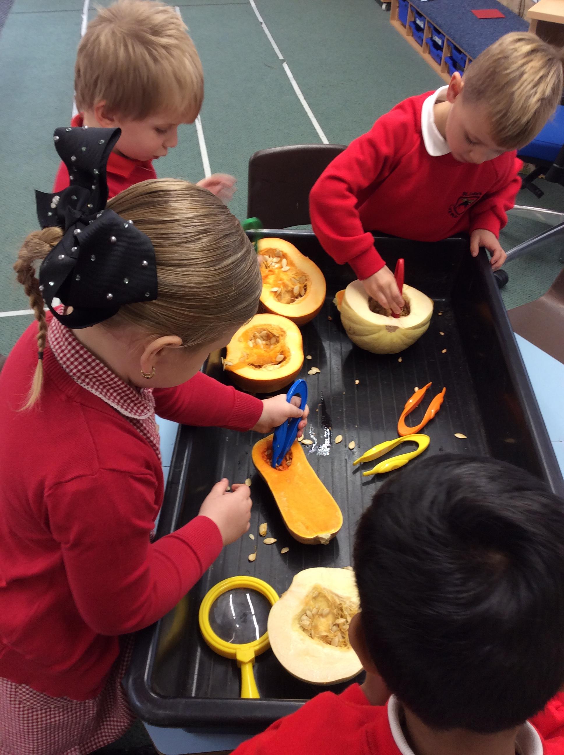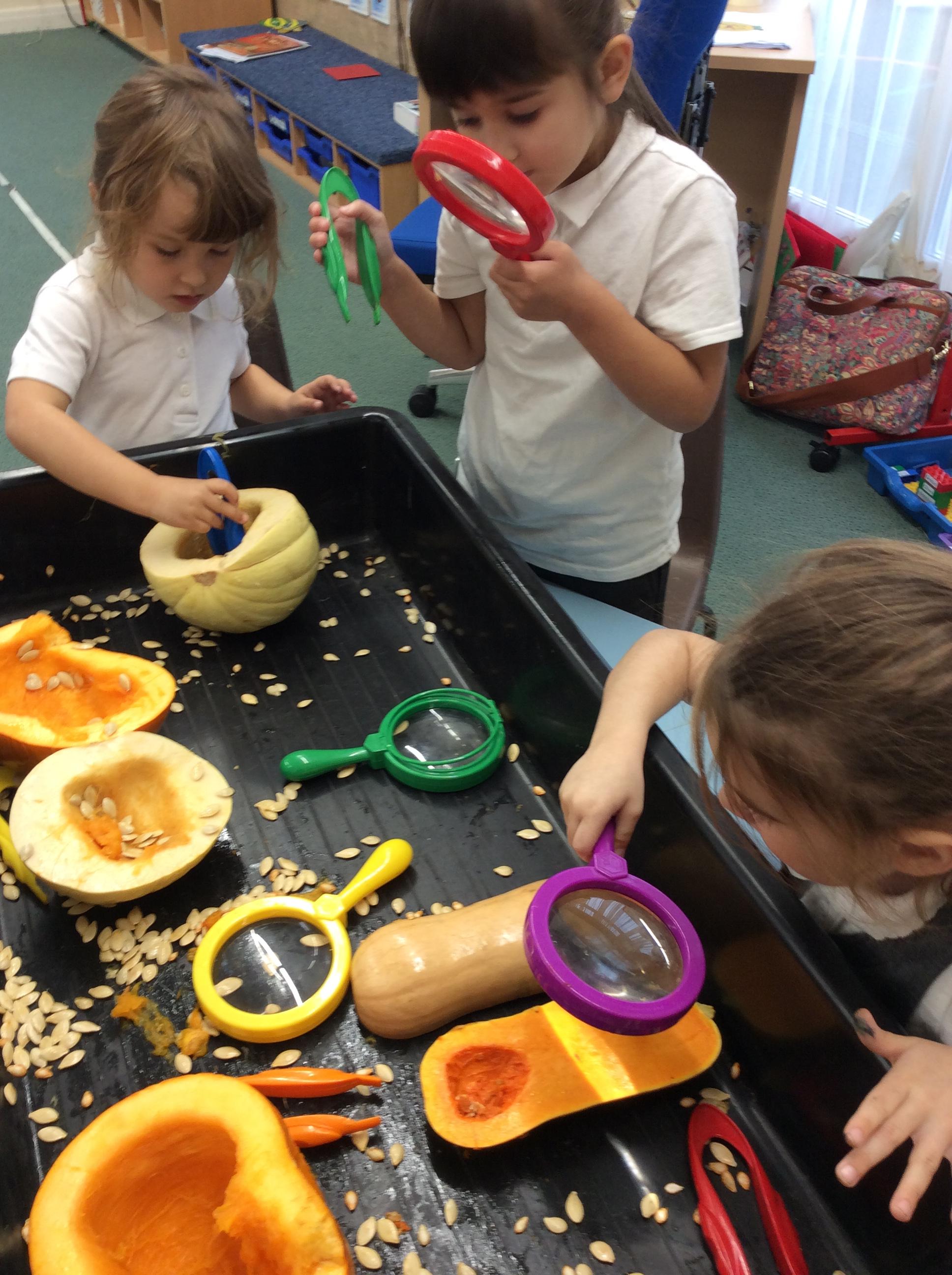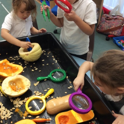 Together, we collected Autumn leaves. We tried to find as many different colours and shapes that we could. We even discovered mushrooms growing on our school field! We found that sycamore seeds 'fly' and spin when the wind carries them. They look like helicopters.